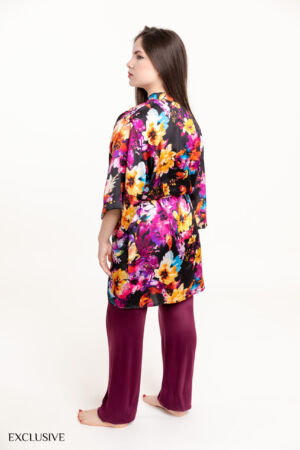 Ensemble Jasmine Noir : Pyjama 3 Pièces avec Kimono en Satin Imprimé Floral pour femmes