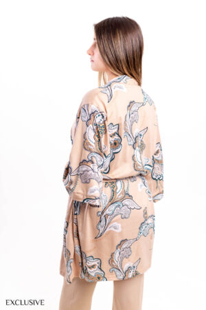 Ensemble Jasmine: Kimono Floral, Débardeur Dentelle & Pantalon Beige