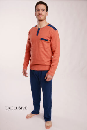 Pyjama Homme Cédric Confort: Pull Boutonné & Pantalon – Bleu/Orangé