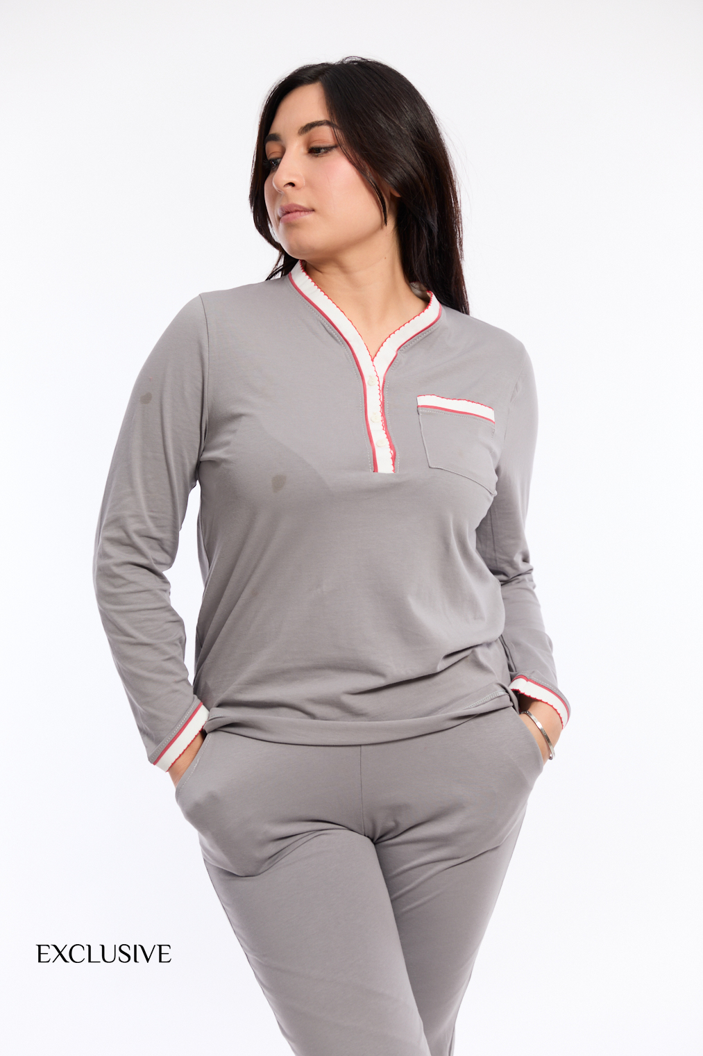 - Fins liserés contrastés sur la chemise et le pantalon